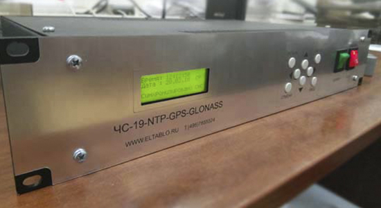 ЧС-19-NTP-GPS-ГЛОНАСС - часовая станция (мастер-часы) от НПП Электронные табло. Российское производство. Обеспечивает синхронное отображение текущего времени на вторичных часах (стрелочные и цифровые) производства НПП Электронные табло и других компаний. Синхронизация станции ведётся от спутниковых навигационных систем GPS и ГЛОНАСС за счёт оборудования поставляемого в комплекте, а синхронизация вторичных часов от встроенного NTP-сервера через интерфейс Ethernet (RJ-45). Отображение времени (ЧЧ:ММ) непосредственно на приборе производится четырьмя символами высотой 20 мм.