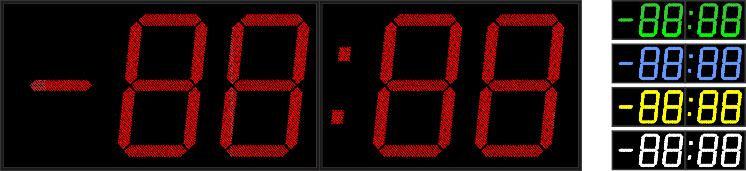 Демонстрация текущего времени выполняется одной LED-секцией, построенной на светодиодах SMD 3528 с чипом Epistar (d=5мм, 6 рядов), которая обеспечивает яркость 1500 мкД (угол половинной яркости равен 60˚). Размер табло 3900х1000 мм, где размещены 4 символа высотой 1000 мм, видимость до 350 метров. Если требуется автоподстройка уровня яркости, то нужно приобрести датчик фоновой освещенности (опция). Цвет светодиодов может быть определен заказчиком, выбор среди вариантов: красный, зеленый, желтый, синий или белый.