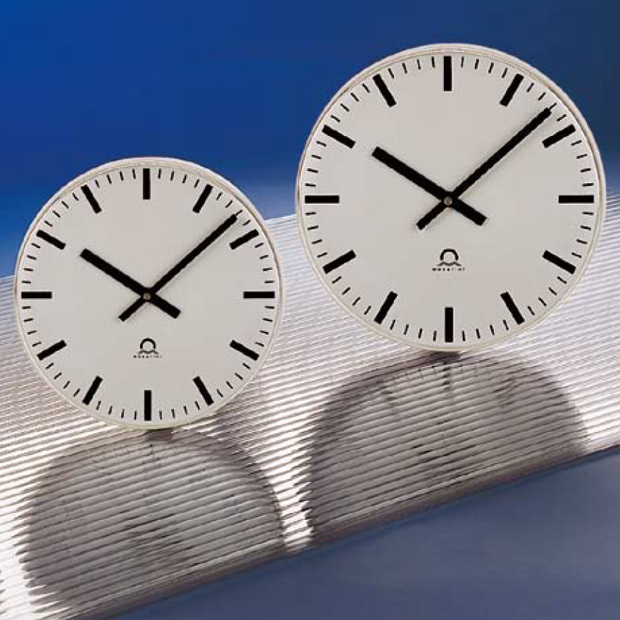 Двусторонние часы составлены из двух односторонних часов при помощи монтажного комплекта ECO.28.SET с боковым (верхним) креплением.