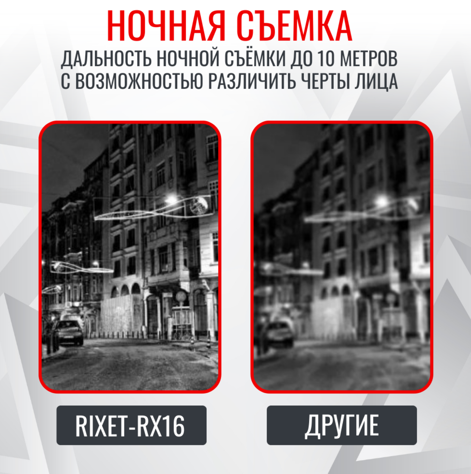 • Ночная съемка: ИК-подсветка дальностью до 10 метров обеспечивает возможность различать черты лиц в темноте.