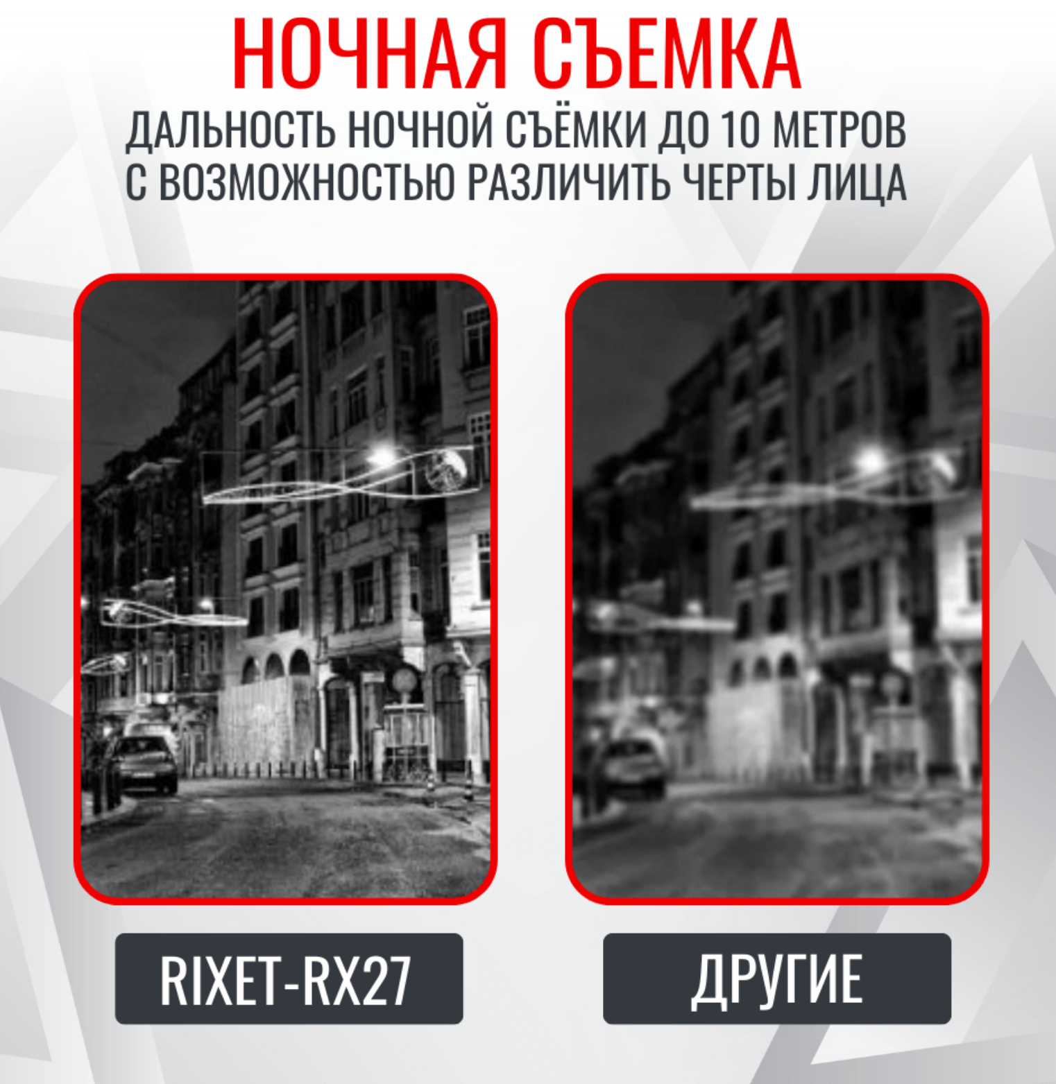 • Ночная съемка: ИК-подсветка дальностью до 10 метров позволяет различать черты лиц в темноте.
