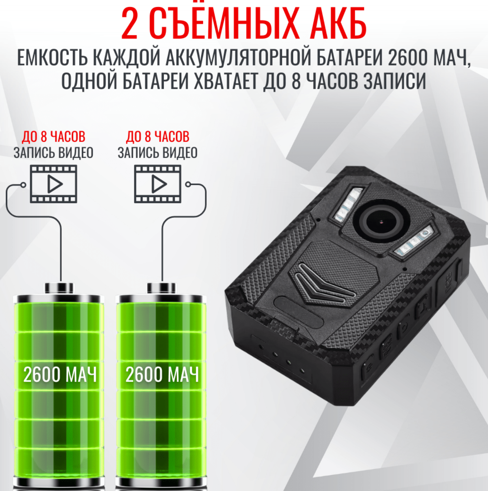 • Долгая автономная работа: 2 съемных аккумулятора по 2600 мАч обеспечивают до 16 часов записи.