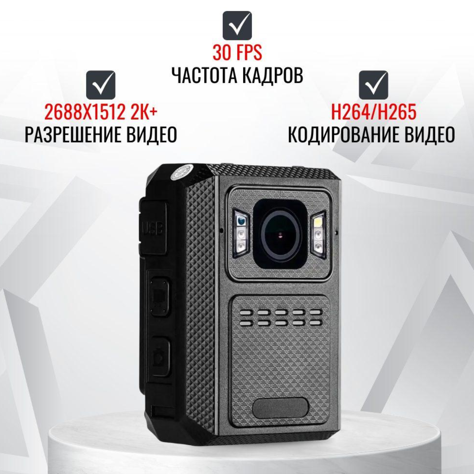 • Высокое качество записи: Запись видео в разрешении 2688x1512 пикселей (2К+), что обеспечивает четкость и детализацию изображения.