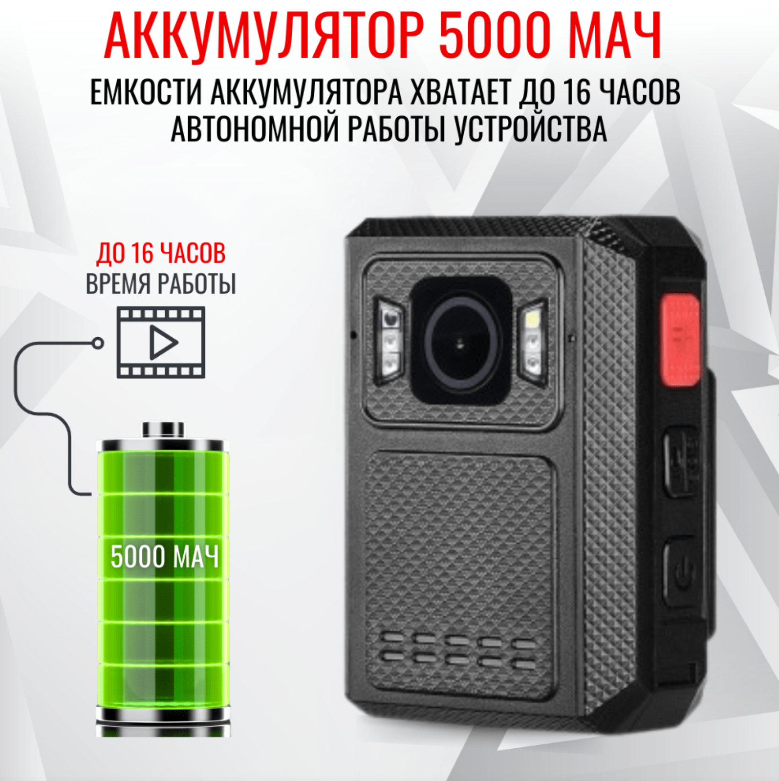 • Долговечная автономность: Встроенная батарея емкостью 5000 мАч позволяет работать до 16 часов без подзарядки.