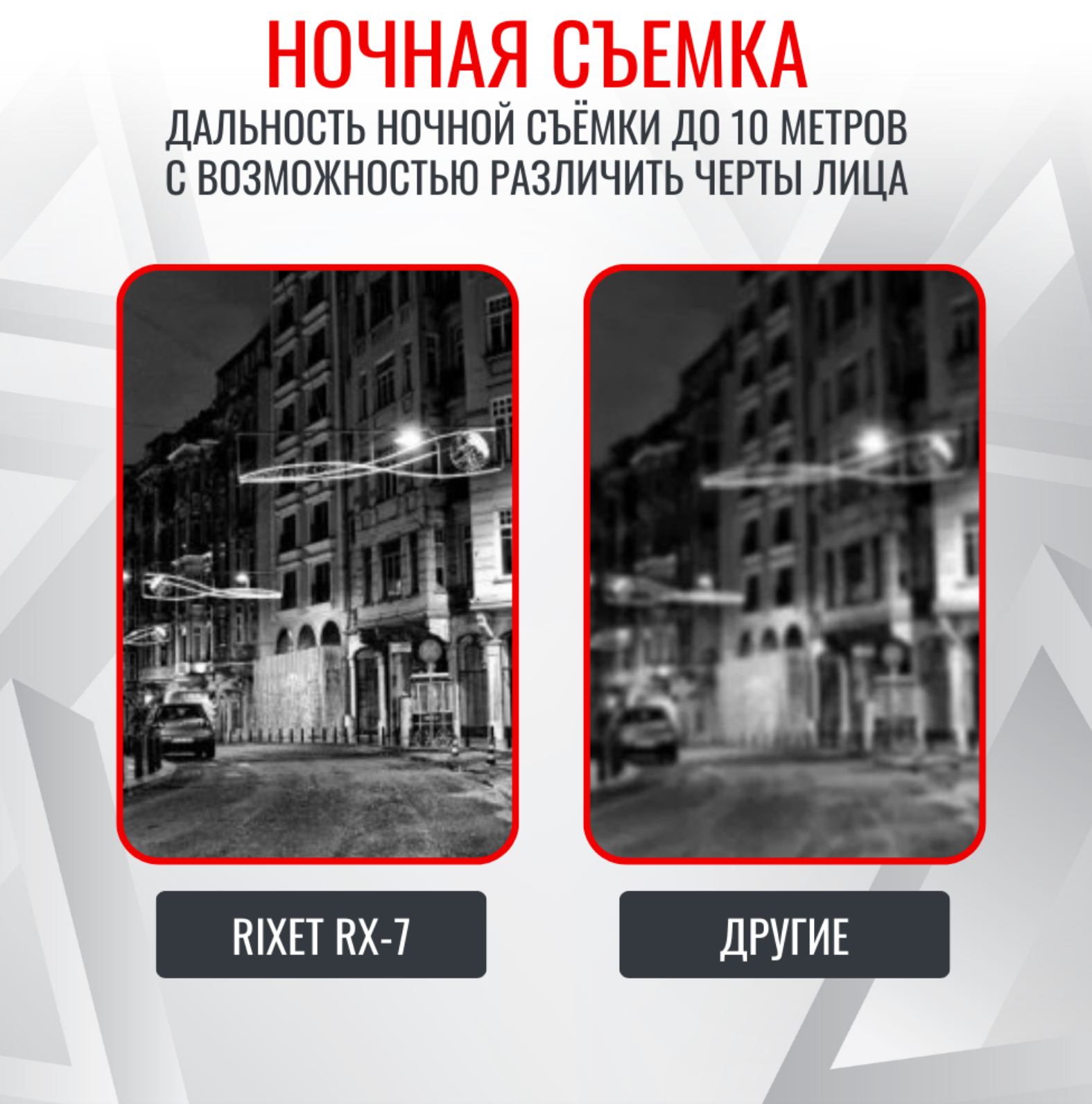 • Ночная съемка: ИК-подсветка обеспечивает возможность съемки в темноте на расстоянии до 10 метров, позволяя различать черты лиц даже в условиях низкой освещенности.