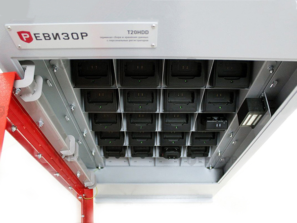 Терминал РЕВИЗОР Т20 HDD используется для проведения одновременного заряда двадцати (20) персональных носимых видеорегистраторов РЕВИЗОР. Помимо функции заряда АКБ указанных устройств, станция собирает с них данные и хранит их либо в собственной памяти, либо на ПК / любом ином внешнем носителе. Стационарная установка в помещении, автоматическая работа.