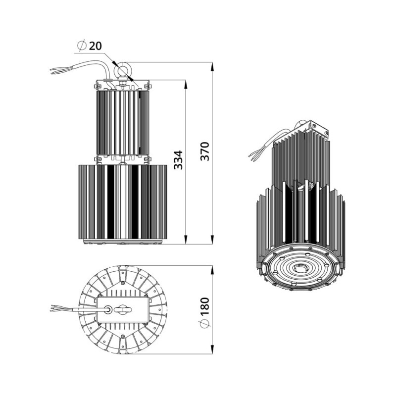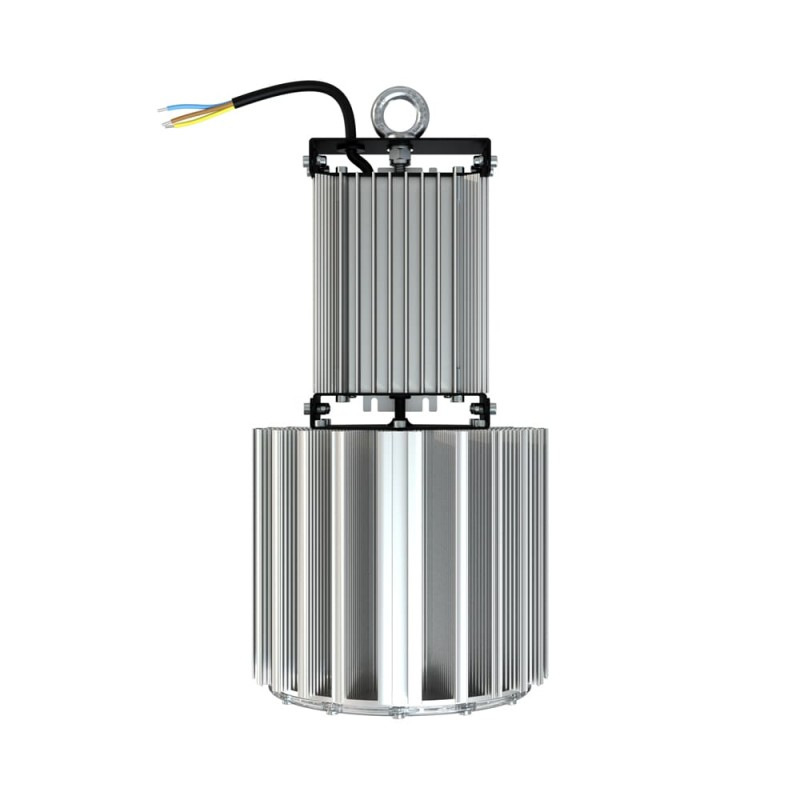 Экструдированный корпус изготовлен из анодированного алюминия, габаритные размеры Ø180×370 мм. Отлично рассеивает тепло выделяющееся при работе светодиодов. Электропитание от сети AC 176-264V 50Hz ± 10% через внешний металлический адаптер заполненный теплопроводным составом. Монтаж подвесной на рым-болт (опционально возможно крепление на кронштейн).