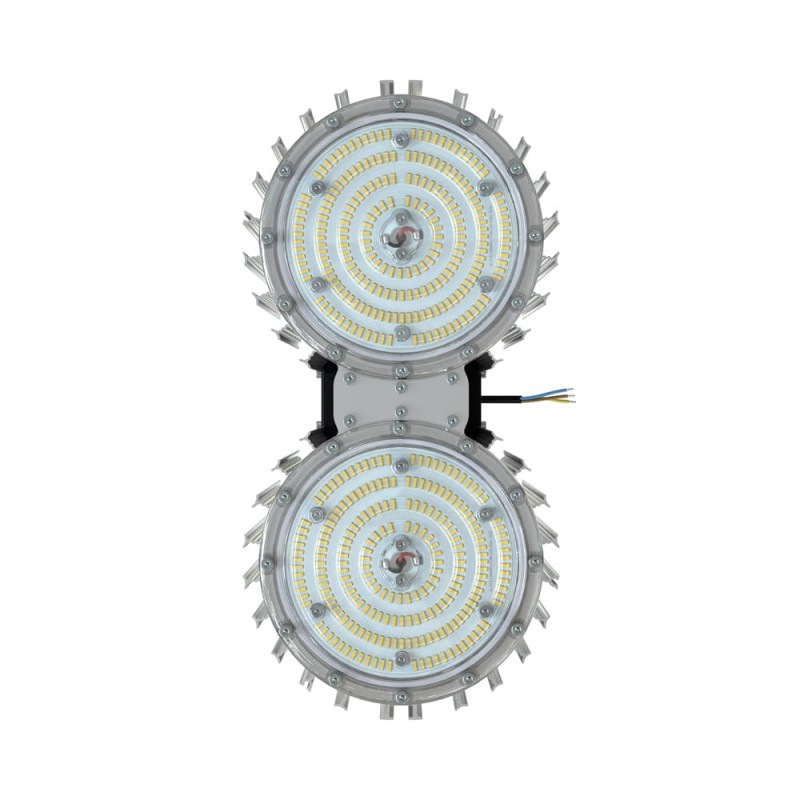 LED источник света выполнен на равномерно распределенных по площади светодиодах Bridgelux. Это позволяет снизить расходы на электроэнергию, так как светодиодный модуль потребляет в несколько раз меньше энергии, чем аналогичный по мощности источник света иного типа. Мощность 200 Вт. Срок эксплуатации светильника примерно 100 000 часов. Прибор оснащен линзой из ударопрочного поликарбоната стабилизированного относительно ультрафиолета. Может быть оснащен отражателем.