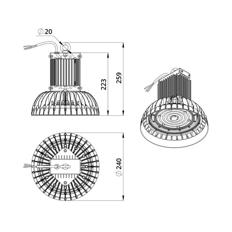 Корпус изготовлен из литого алюминиевого сплава, габаритные размеры Ø240×259 мм. Отлично рассеивает тепло выделяющееся при работе светодиодов. Электропитание от сети AC 176-264V 50Hz ± 10% через внешний металлический адаптер заполненный теплопроводным составом. Монтаж подвесной на рым-болт (опционально возможно крепление на кронштейн). IP67, УХЛ1.