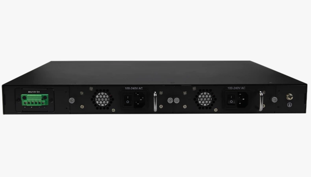 Рэковый металлический корпус, габаритные размеры 440х44х240 мм (1U). Питание от сети 220В (2 блока питания) с резервированием от внешнего локального источника постоянного тока DC 48В. Совместим с сетевым оборудованием BDCOM, ZTE, Huawei.