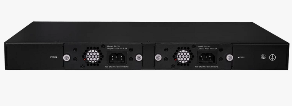 Рэковый металлический корпус, 1U. Питание от сети 220В (два блока питания) с резервированием от внешнего локального источника постоянного тока DC 48В. Совместим с сетевым оборудованием BDCOM, ZTE, Huawei.