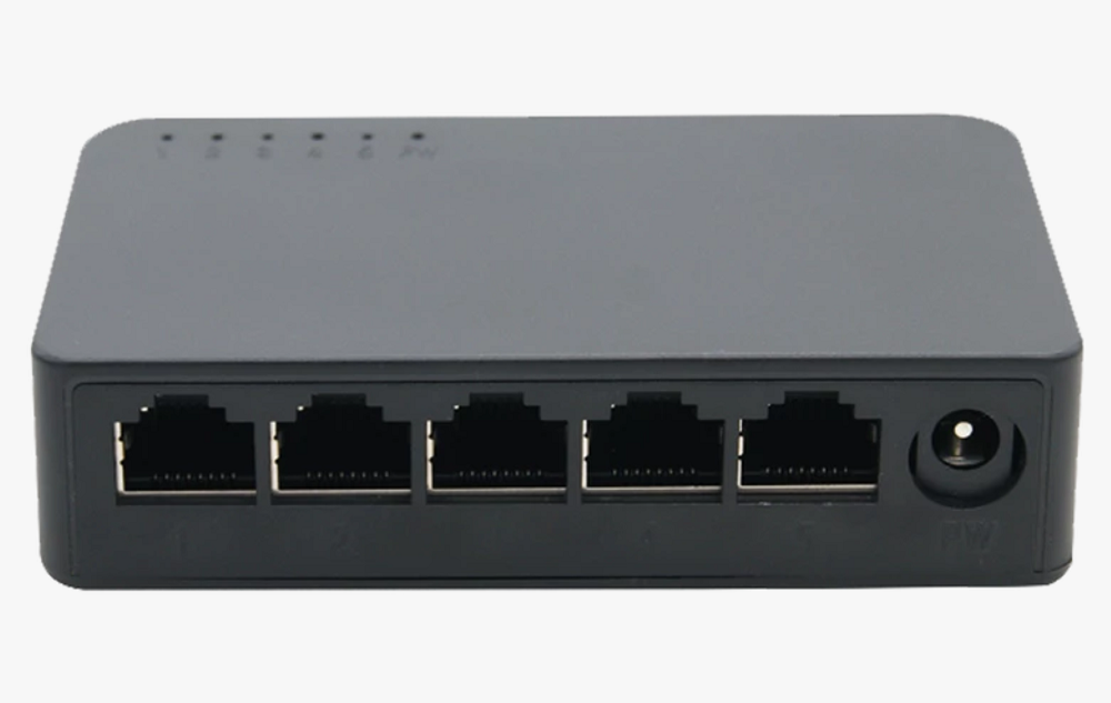 Оснащение: пять сетевых портов, 5x RJ-45, скорость передачи данных 10 или 100 Мбит/сек. Поддерживает сетевые стандарты IEEE802.3, IEEE802.3x Flow control и IEEE802.3u. Подключение к коммутатору производится с помощью цифрового кабеля категории UTP-5E или выше, максимальная удаленность от коммутатора = 100 метров, после подключения производится автоматическое определение устройств и настройка работы с ними.
