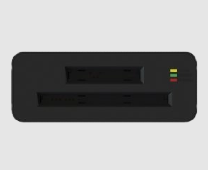 Предусмотрено два зарядных слота, одновременно можно заряжать 2 АКБ. Параметры на входе: напряжение +12В, ток 1А; ток заряда на выходе до 1.5А. Светодиодная индикация работы. Питание от сети, через адаптер поставляемый в комплекте. Черный цвет.