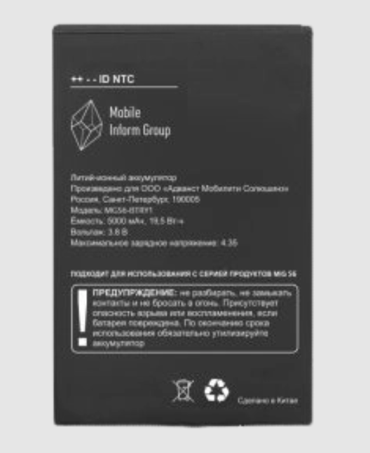 Mobile Inform Group MGS6-BTRY1 — это сменная аккумуляторная батарея для промышленного смартфона MIG S6, включая его взрывозащищенное исполнение MIG S6 Ex и терминал сбора данных ТСД MIG S6.
