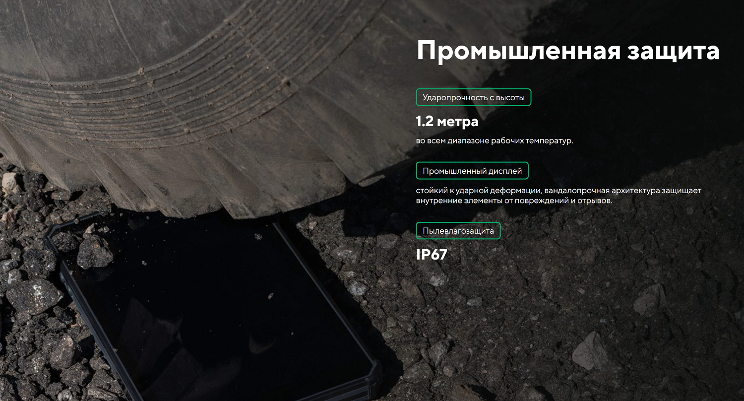 Защищенный мобильный компьютер (планшет) для различных задач и надежной связи в мобильных сетях 4G; 2 nano-Sim. Операционная система РЕД ОС М (Android 10 опция). Процессор Qualcomm SDM632 1,8 ГГц, ОЗУ 4 Гб RAM, ПЗУ 64 Гб (microSD до 256 Гб), фронтальная камера 5 Мп, задняя камера 13 Мп (вспышка и автофокус). Ударопрочный экран, диагональ 8", 800*1280 px (HD), светимость 500 нит, поддержка работы в перчатках и под прямым дождем. Модули Wi-Fi, Bluetooth 4.2, NFC и поддержка функции PTT. Поддержка спутниковой навигации GPS, ГЛОНАСС, BeiDou, Galileo. Кнопки управления, включая 4 функциональные, свободно программируемые. Разъемы: 2х USB Type-A OTG, 1х USB Type-C OTG, 1х micro HDMI и 1х Pogo-pin. Морозостойкий, съемный Li-Pol аккумулятор, емкость 7000 мАч, полный заряд за 3,5 часа. Современный дизайн, ударопрочный корпус со степенью защиты IP67, выдерживает падение на бетон с высоты 1.2 м, виброустойчив к частотам 1-80 Гц. Габаритные размеры 212x133x19 мм, вес 520 г. Рабочие температуры от -20 до +60°C.