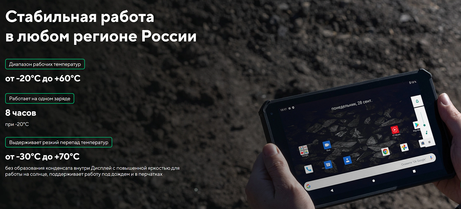 Защищенный мобильный компьютер (планшет) для различных задач и надежной связи в мобильных сетях 4G; 2 nano-Sim. Операционная система Android 10 (GMS/без GMS; РЕД ОС М опция). Процессор Qualcomm SDM632 1,8 ГГц, ОЗУ 4 Гб RAM, ПЗУ 64 Гб (microSD до 256 Гб), фронтальная камера 5 Мп, задняя камера 13 Мп (вспышка и автофокус). Ударопрочный экран, диагональ 8", 800*1280 px (HD), светимость 500 нит, поддержка работы в перчатках и под прямым дождем. Модули Wi-Fi, Bluetooth 4.2, NFC и поддержка функции PTT. Модуль RTK для высокоточного определения координат по спутникам GPS, ГЛОНАСС, BeiDou, Galileo; точность до 2-х см. Кнопки управления, включая 4 функциональные, свободно программируемые. Разъемы: 2х USB Type-A OTG, 1х USB Type-C OTG, 1х micro HDMI и 1х Pogo-pin. Морозостойкий, съемный Li-Pol аккумулятор, емкость 7000 мАч, полный заряд за 3,5 часа. Современный дизайн, ударопрочный корпус со степенью защиты IP67, выдерживает падение на бетон с высоты 1.2 м, виброустойчив к частотам 1-80 Гц. Габаритные размеры 212x140x19 мм, вес 560 г (без антенны). Рабочие температуры от -20 до +60°C.