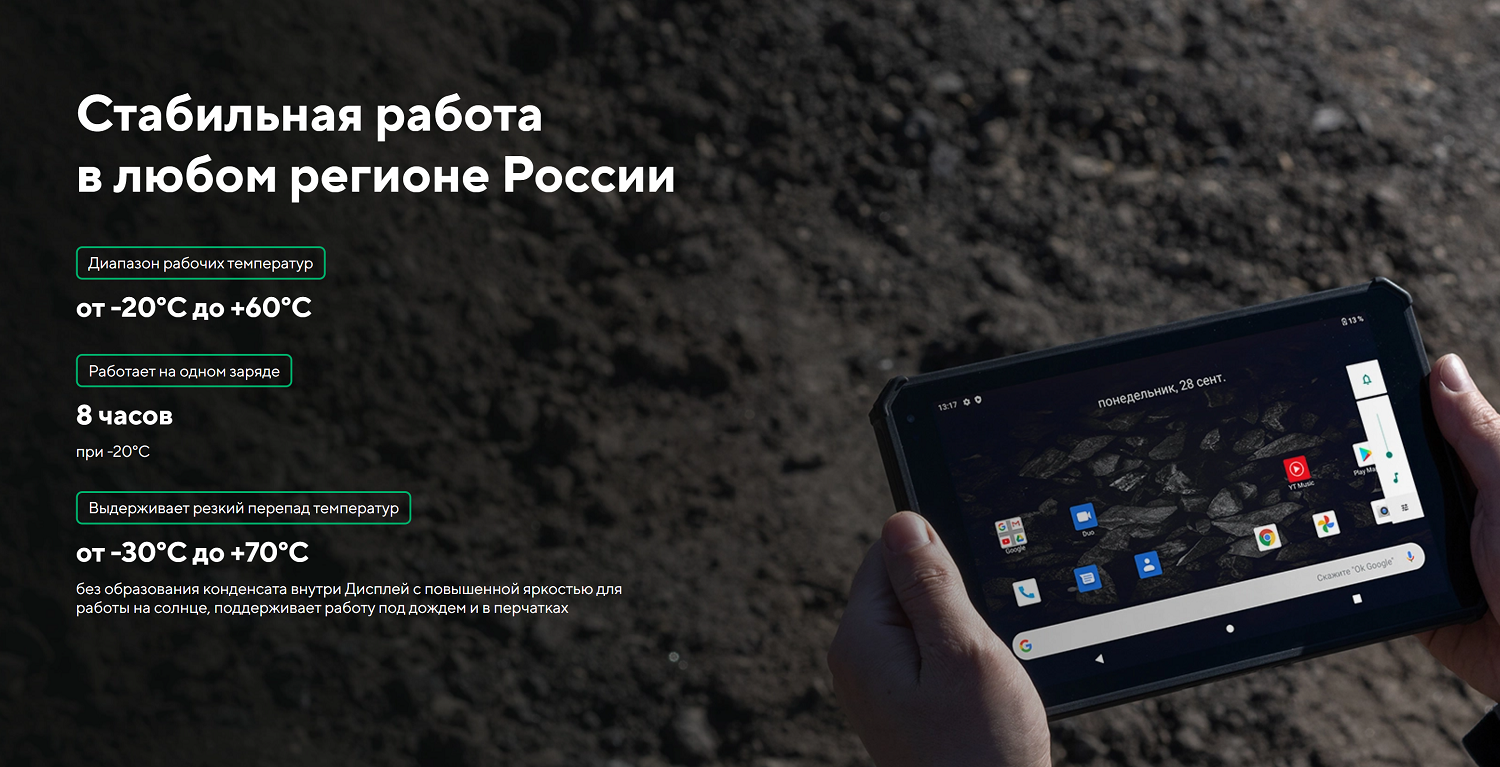 | Экран | 800*1280 (HD), 8 дюймов, ударопрочный, с повышенной читаемостью на солнце (светимость 500 нит), поддержка работы в перчатках, поддержка работы под дождем |