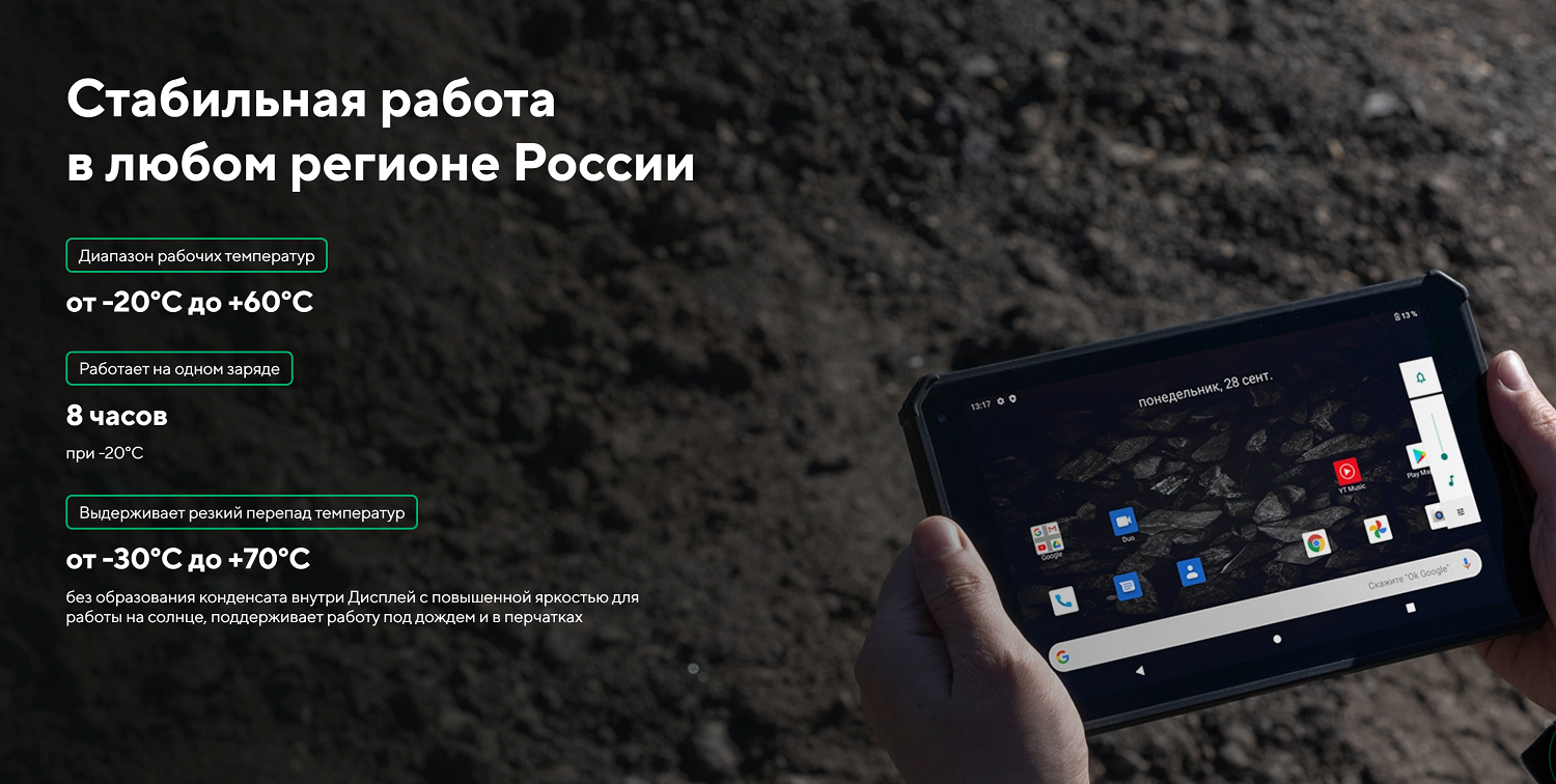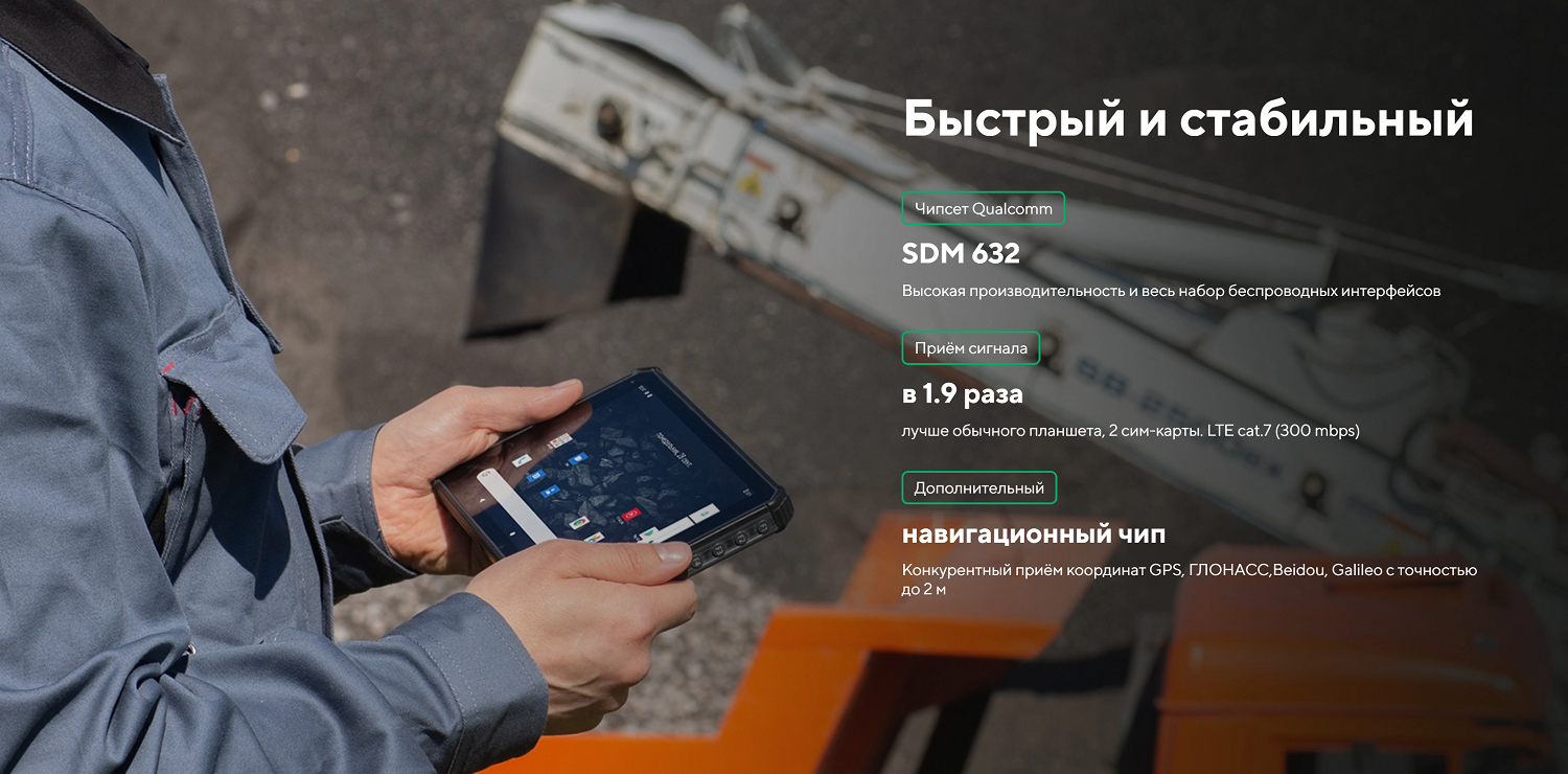 | Экран | 800*1280 (HD), 8 дюймов, ударопрочный, с повышенной читаемостью на солнце (светимость 500 нит), поддержка работы в перчатках, поддержка работы под дождем |