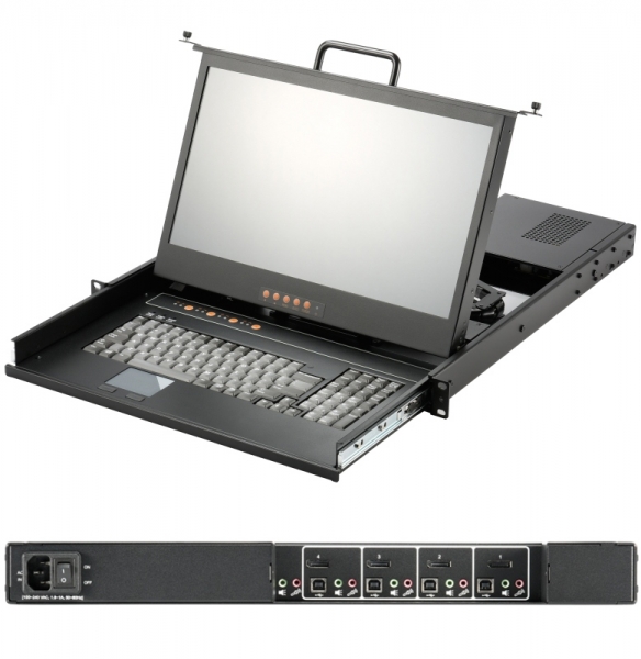 Промышленная KVM-консоль AMK704-194BRU — это устройство эксплуатируемое в промышленных условиях с целью дистанционного управления несколькими компьютерами, отвечающими за какие-либо технологические процессы. Аббревиатура KVM (keyboard, video, mouse) означает что в составе прибора объединены как минимум три периферийных устройства: дисплей, клавиатура и манипулятор, тачпад или подобный. В данной модификации, помимо указанных устройств предусмотрены также динамик и микрофон.