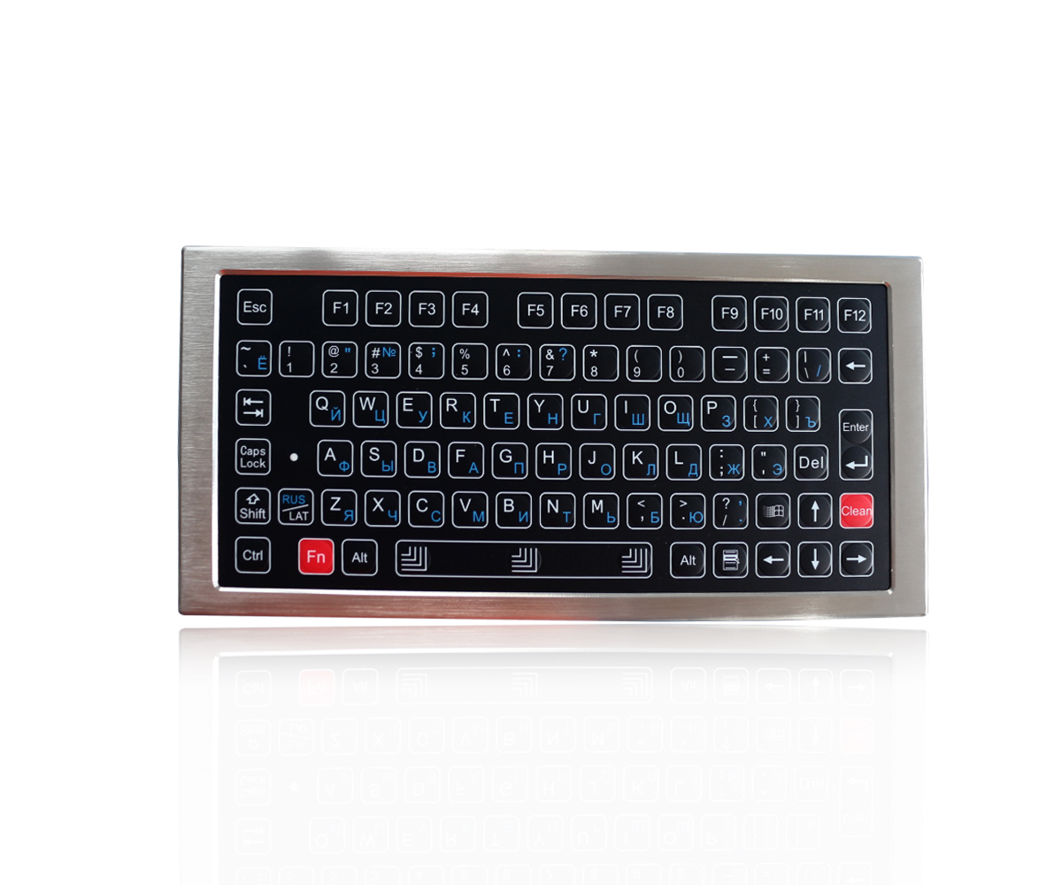 Клавиатура полностью выполнена из нержавеющей стали, габаритные размеры 300x145x26.5 мм, вес 1.8 кг, черный цвет. Рабочие температуры от -20 до +65°C. Ресурс выработки каждой клавиши более 1 миллиона нажатий, наработка на отказ (MTBF) = 20 000 часов.