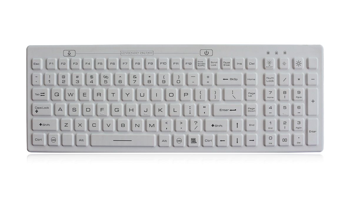 Клавиатура выполнена из силикона с износостойким антимикробным гигиеническим покрытием. Габаритные размеры 380x130x10 мм, вес 0.8 кг, белый цвет. Настольный монтаж. Ресурс выработки каждой клавиши более 5 миллионов нажатий, общая наработка на отказ (MTBF) = 20 000 часов.