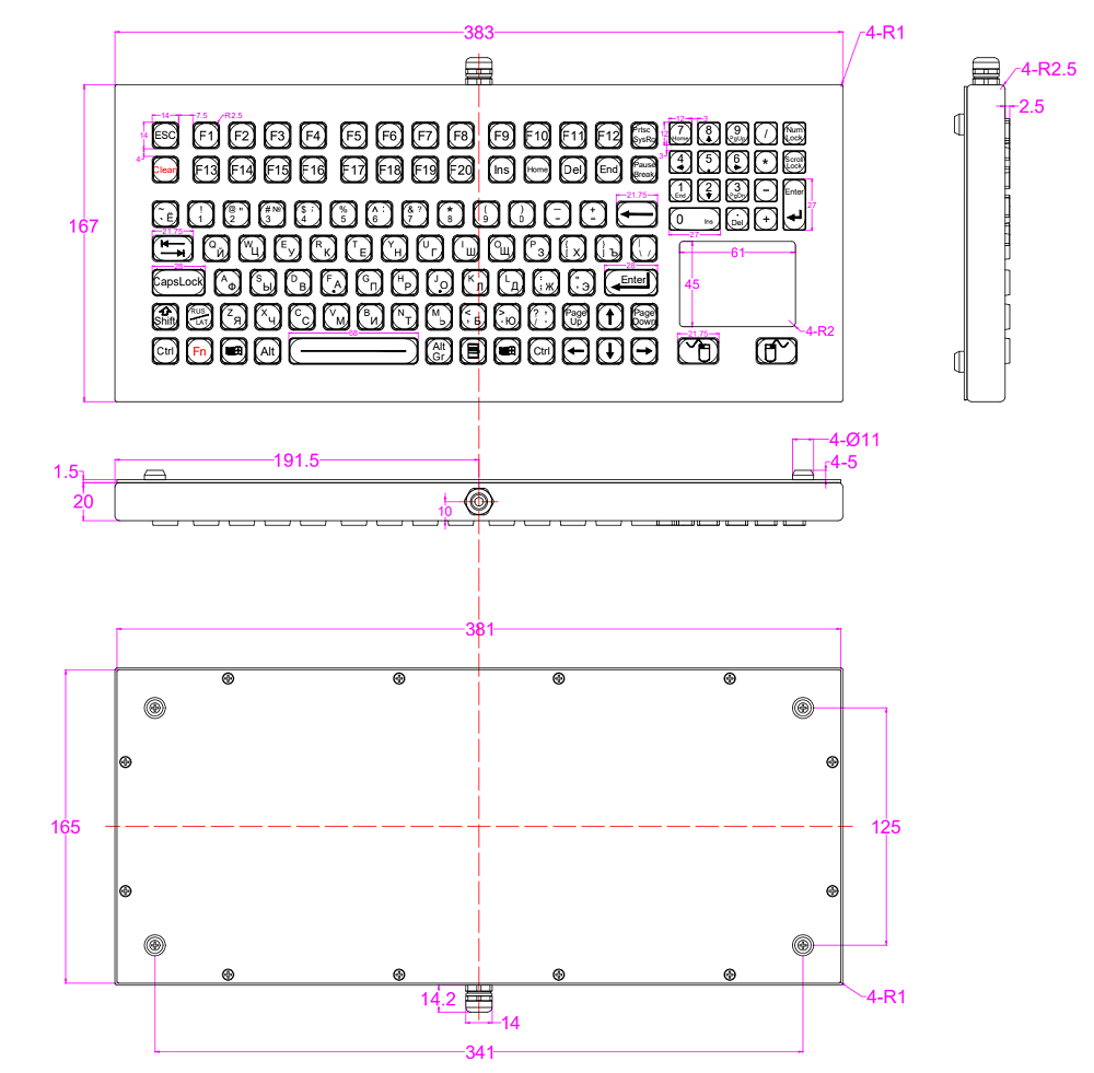 Включает в себя 116 мягких, почти бесшумных клавиши (в том числе NumPad, 20x Fn и 2 для кнопок мышки) с коротким ходом (1.2 мм) и позолоченными карбоновыми контактами ("carbon-on-gold"). Клавиши срабатывают при нажатии силой в 2Н. Русская и английская раскладки. Предусмотрена возможность блокировки кнопок для чистки и мытья устройства без отключения от ПК. Герметичный тачпад - сенсорная емкостная панель с композитным покрытием, разрешение 40 точек/мм. Подключение через интерфейс USB.
