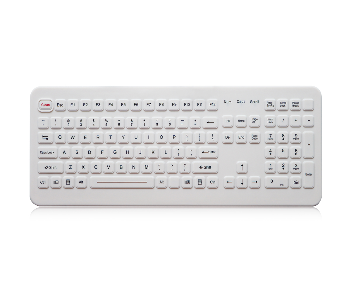 Клавиатура выполнена из промышленного силикона с износостойким антимикробным гигиеническим покрытием. Габаритные размеры 405x155x20 мм, вес 1.2 кг, белый цвет. Настольный монтаж. Ресурс выработки каждой клавиши более 5 миллионов нажатий, общая наработка на отказ (MTBF) = 20 000 часов.