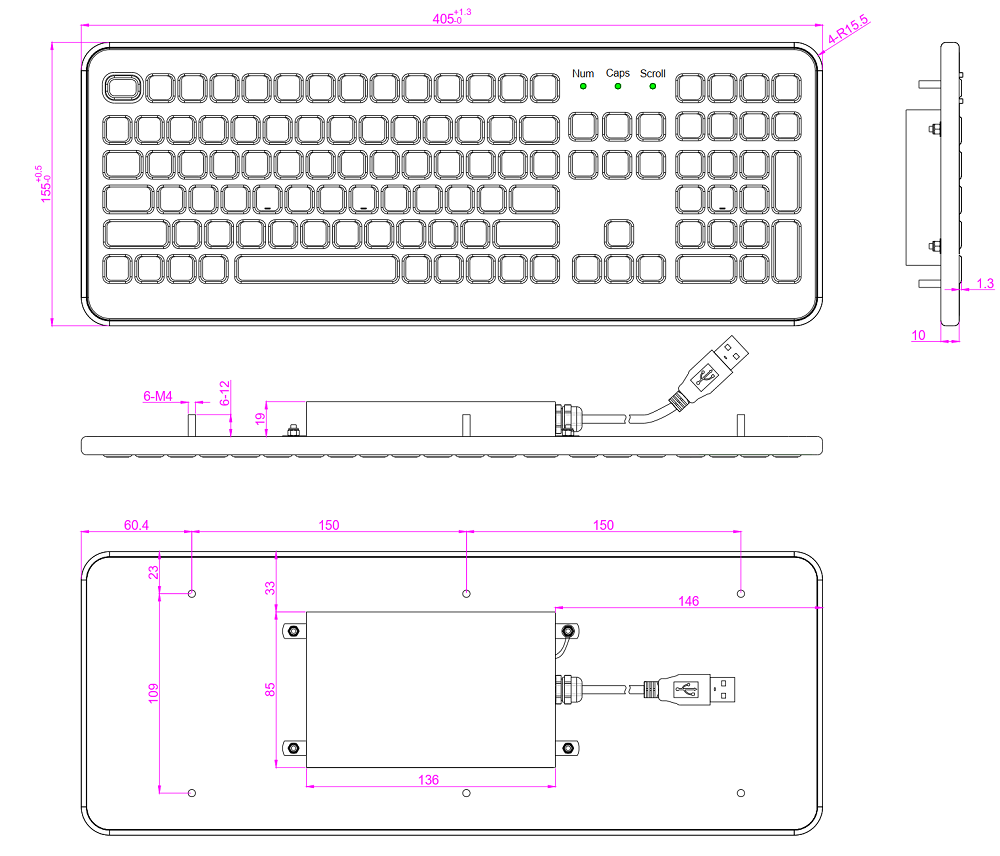 Корпус клавиатуры выполнен из алюминия, а лицевая часть из промышленного силикона с износостойким антимикробным гигиеническим покрытием. Габаритные размеры 405x155 мм, вес 1.3 кг, черный цвет. Встраивается в панель сверху.