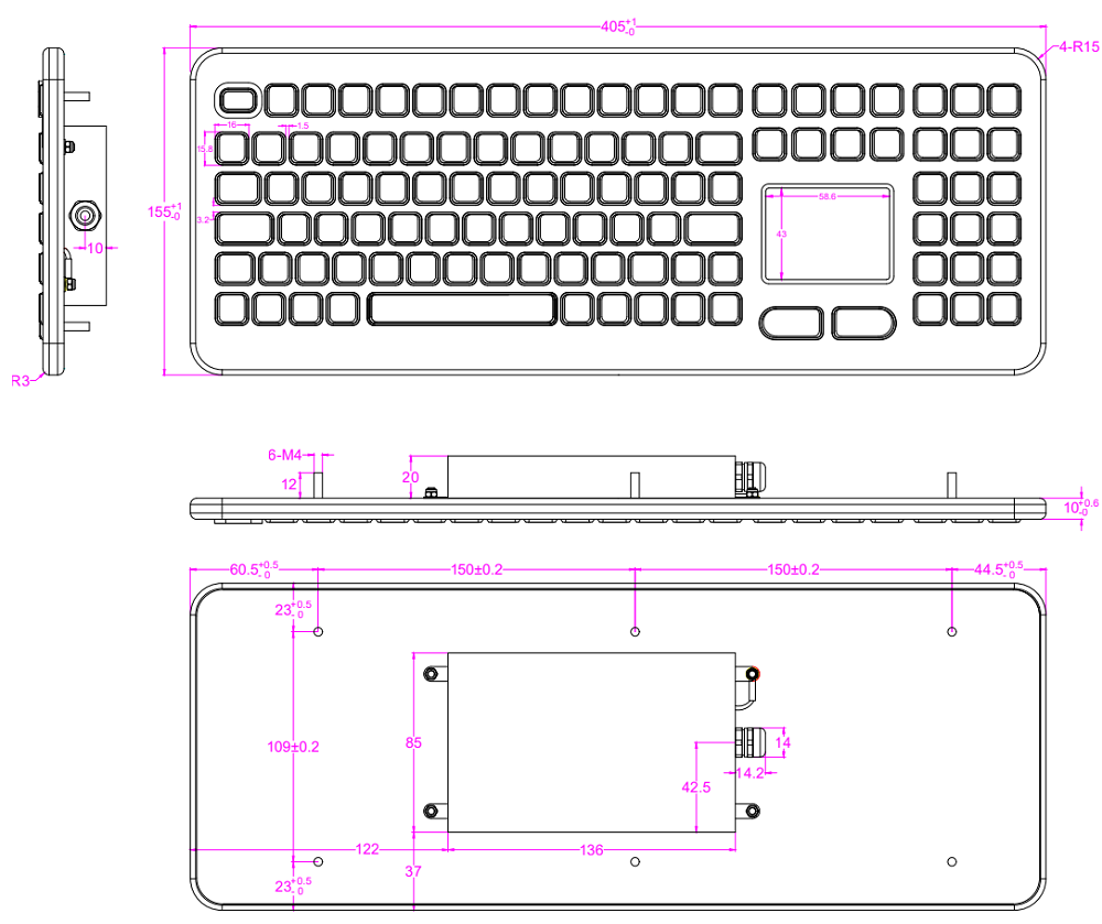 Корпус клавиатуры выполнен из алюминия, а лицевая часть из промышленного силикона с износостойким антимикробным гигиеническим покрытием. Габаритные размеры 405x155 мм, вес 1.3 кг, черный цвет. Встраивается в панель сверху.