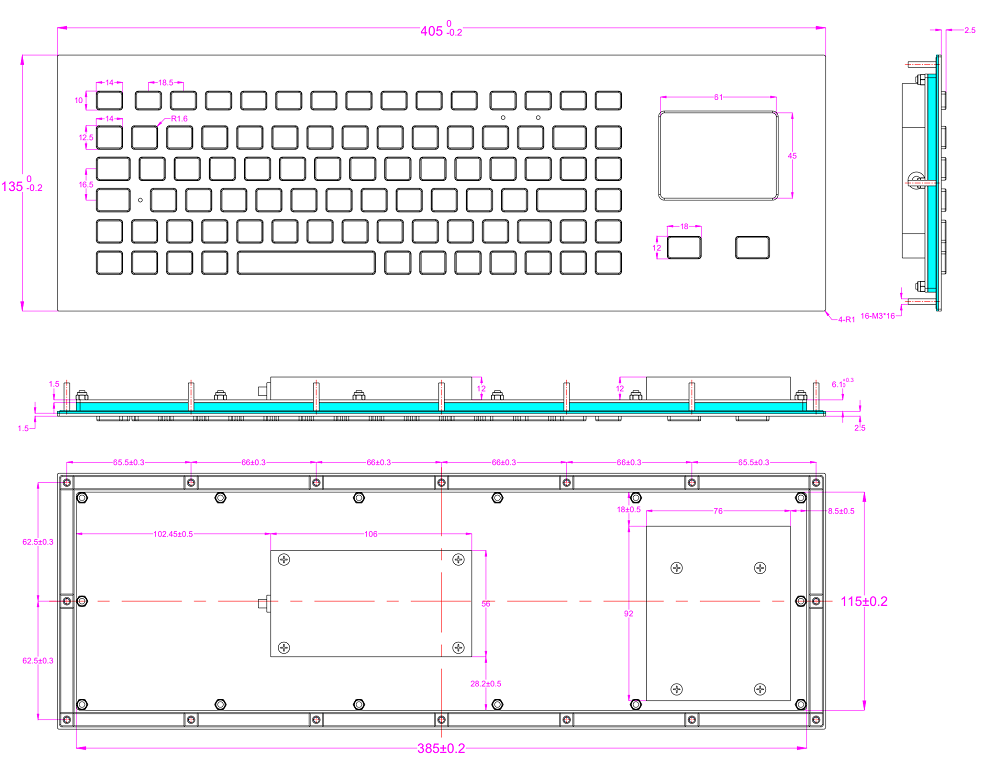 Корпус клавиатуры выполнен из нержавеющей стали, а лицевая часть из промышленного силикона с износостойким антимикробным гигиеническим покрытием. Габаритные размеры 405x135 мм, вес 1.5 кг, серебристый цвет. Встраивается в панель сверху. Ресурс выработки каждой клавиши более 5 миллионов нажатий, общая наработка на отказ (MTBF) = 20 000 часов.