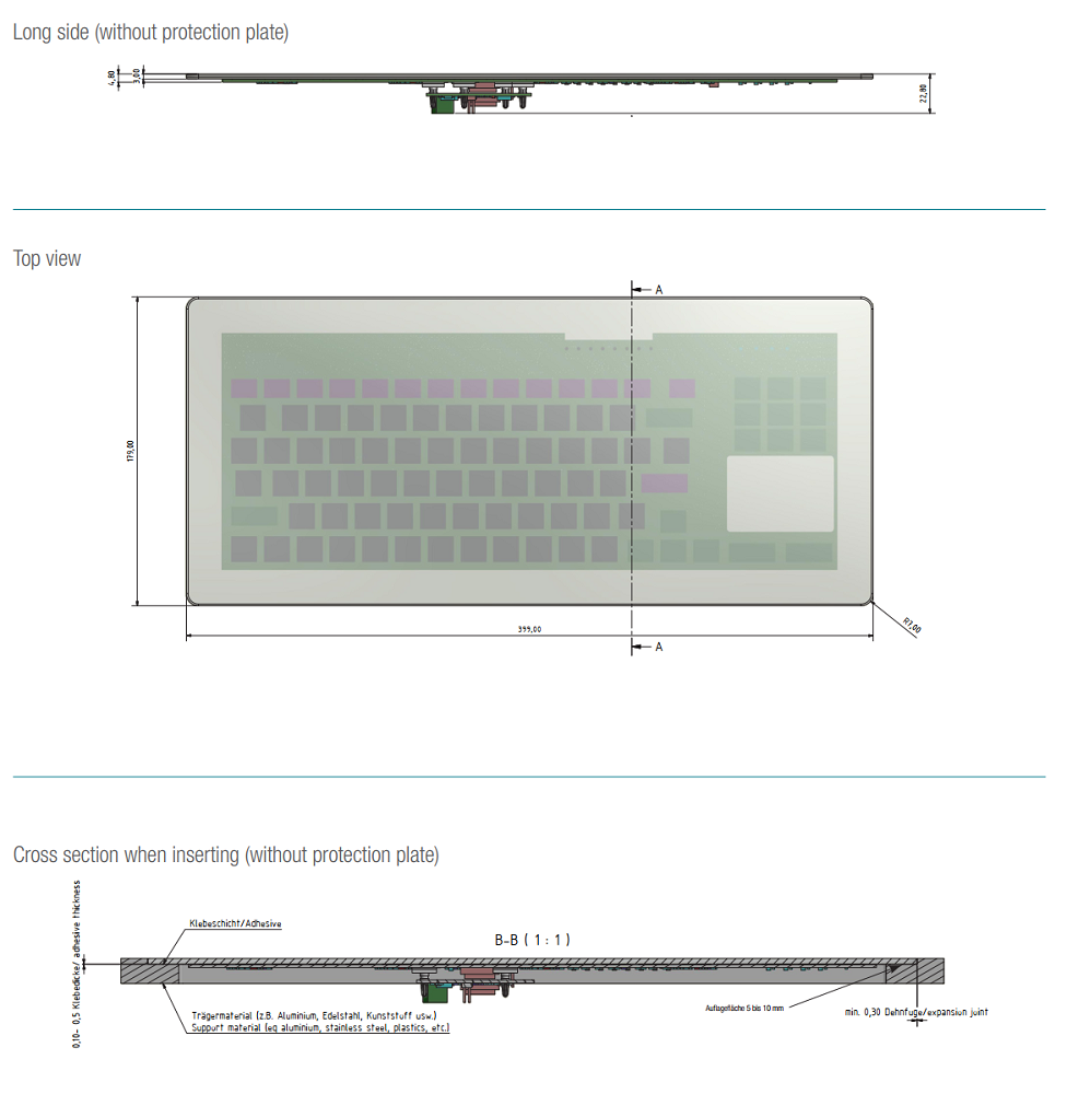 Передняя панель, как уже указывалось, изготовлена из закаленного стекла, толщина 3 мм; защитный кожух отсутствует. IP65 по передней панели. Габаритные размеры 399x179x22.8 мм, белый цвет. Рабочие температуры от 0 до +60°C. Тип монтажа - вклеивание в панель с помощью адгезивного материала (промышленный клей и тп).