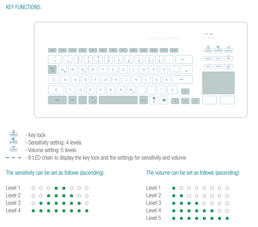 Включает в себя 86 основных эргономичных клавиши, в том числе три специализированные кнопки, отвечающие за регулировку чувствительности касаний к клавишам (4 уровня), наличие и уровень громкости при печатании (5 левелов), а также клавишу для блокировки срабатывания всех остальных, что необходимо при чистке и/или мытье клавиатуры. Только английская раскладка. Тачпадом является сенсорная емкостная панель с размером площадки 60 х 42 мм. Информативная индикация восемью светодиодами. Подключение через разъем USB.