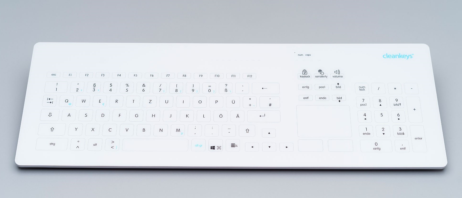 InduKey TKR-103-TOUCH-KGEH-VESA-WHITE-USB-US/EU — это промышленная емкостная клавиатура с тачпадом, чья передняя панель полностью покрыта защитным ударопрочным стеклом Corning® Gorilla® Glass. Второй вариант артикула (название модели) KR23211.