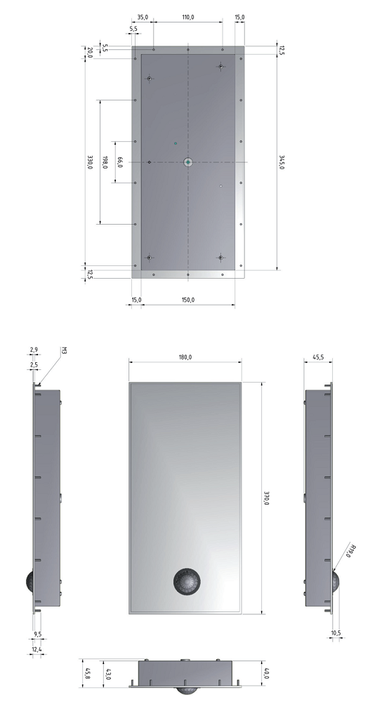 Габаритные размеры 370x180x45.8 мм, вес 1.1 кг, белый цвет. Монтаж встраиваемый. Степень защиты от влаги и пыли IP65, а при работе с трекболом IP54; рабочие температуры от 0 до +70°C.