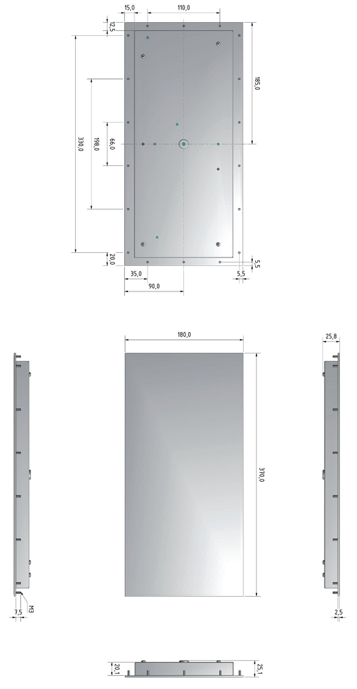 Габаритные размеры 370x180x25.8 мм, вес 1 кг, белый цвет. Монтаж встраиваемый. Степень защиты от влаги и пыли IP65 по передней панели; рабочие температуры от 0 до +70°C.