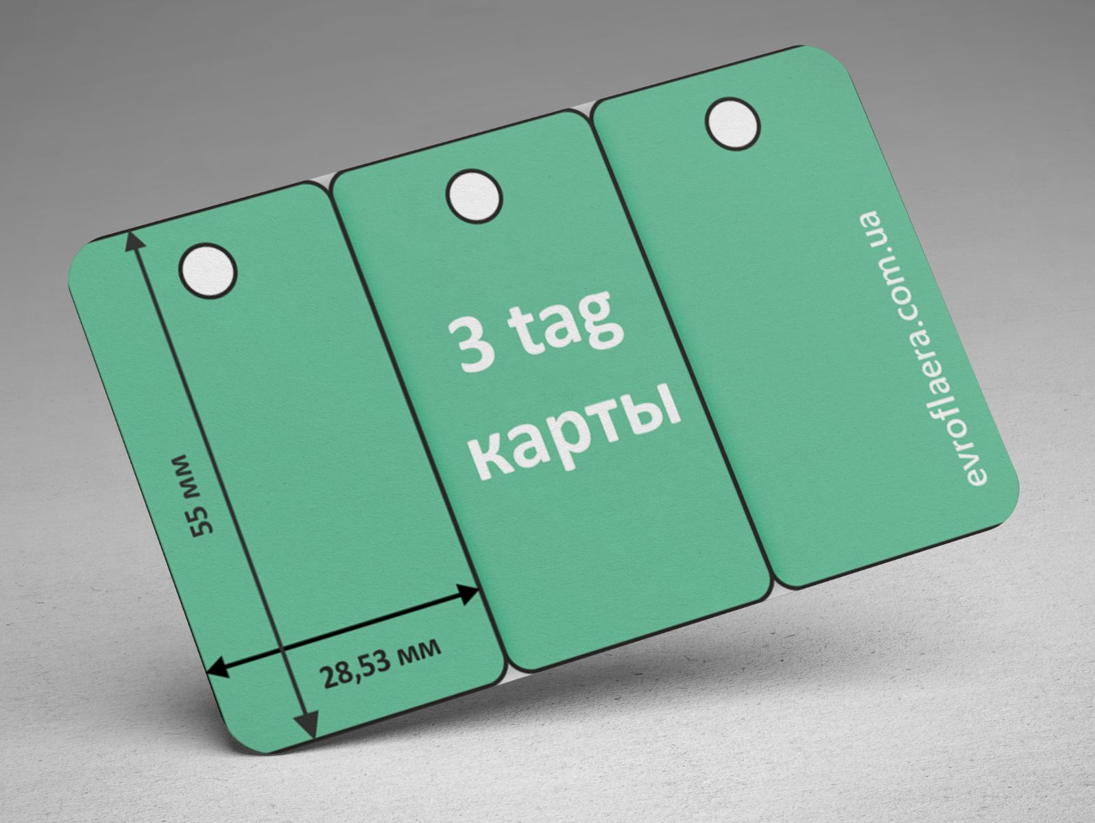 3-tag карта — это пластиковая карта со специальными надсечками, позволяющими легко разделить её на три самостоятельные мини-карты. Такой формат применяется в программах лояльности, когда необходимо предоставить возможность нескольким людям пользоваться одним клиентским номером, скидкой или бонусным счётом. Оформляя одну карту, компания фактически получает сразу трёх активных пользователей.