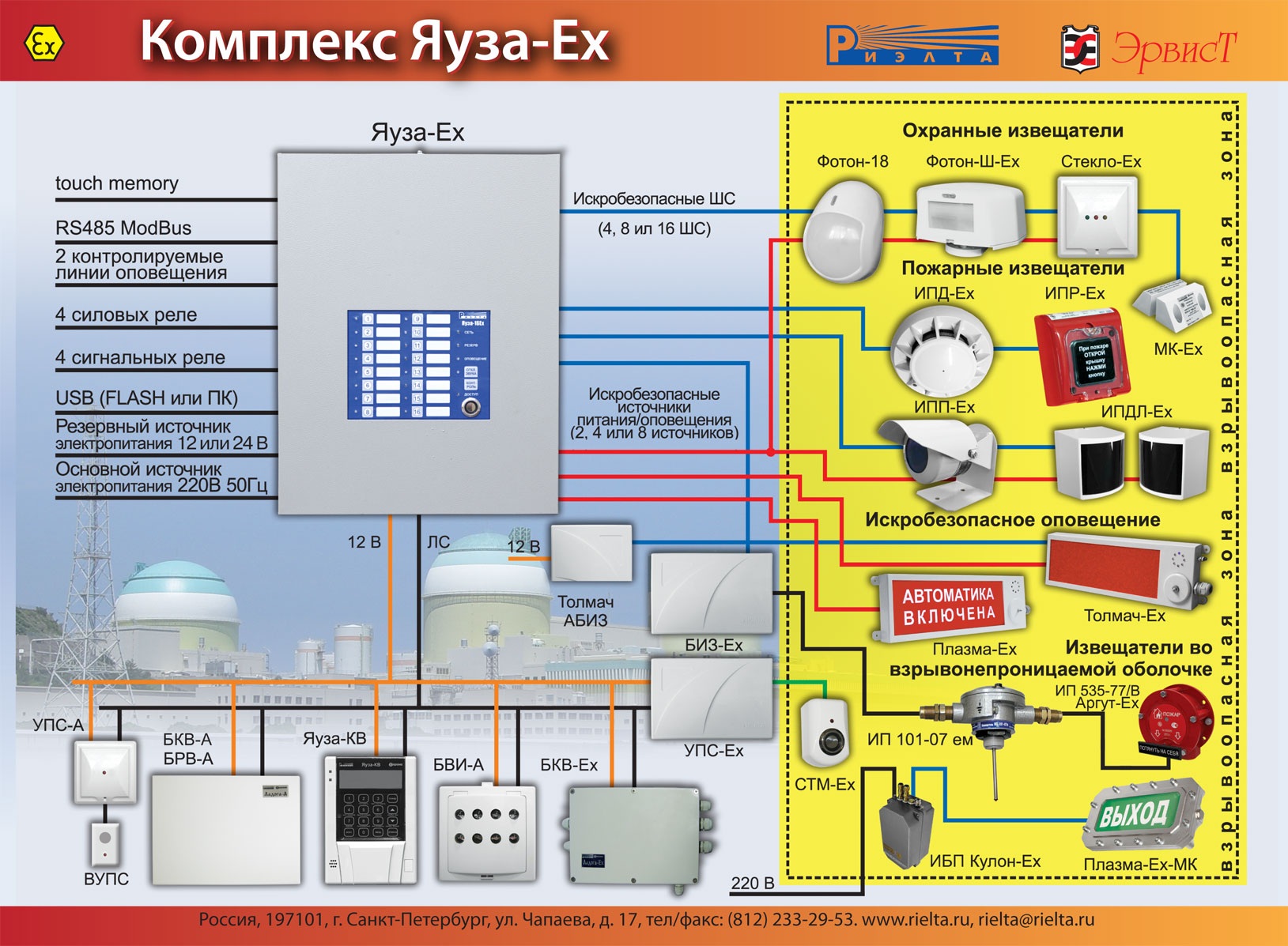 ЯУЗА-Ех — это унифицированный комплекс оборудования для построения систем пожарной, охранной и охранно-пожарной сигнализации, а также систем автоматического пожаротушения и оповещения о пожаре на объектах, где возможна поява взрывоопасных газовых смесей (зоны класса 1 по ГОСТ Р 51330.9 и ниже).