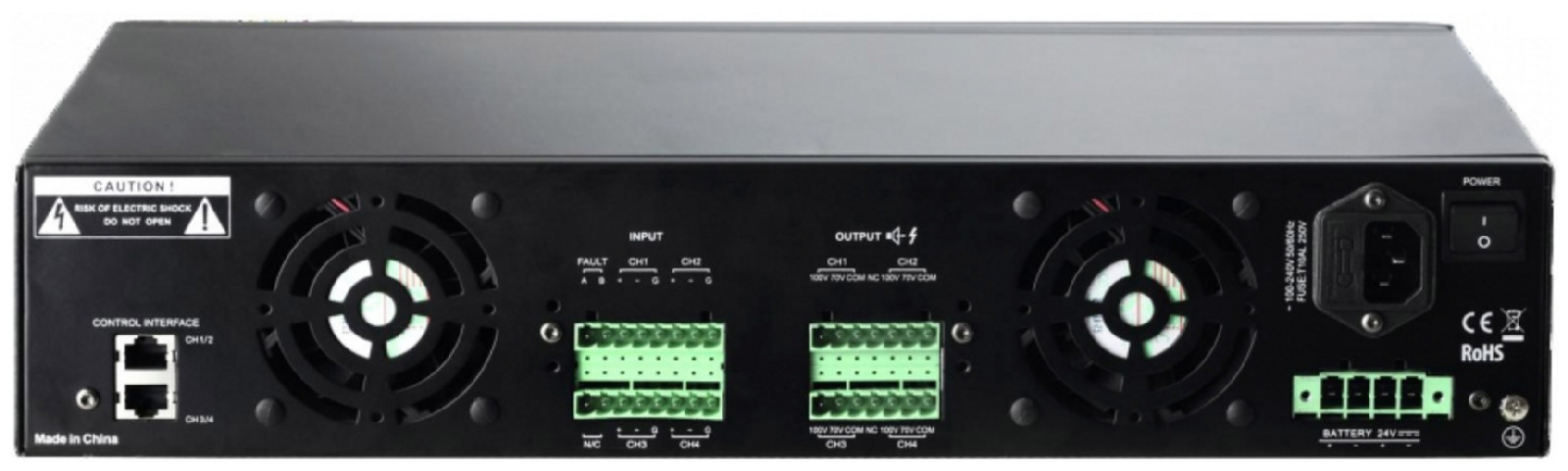 Мощность усилителя 500 Вт, распределённая на 4 канала трансляции ( 4 х 125 Вт), напряжение трансляционной линии 100/70 В.