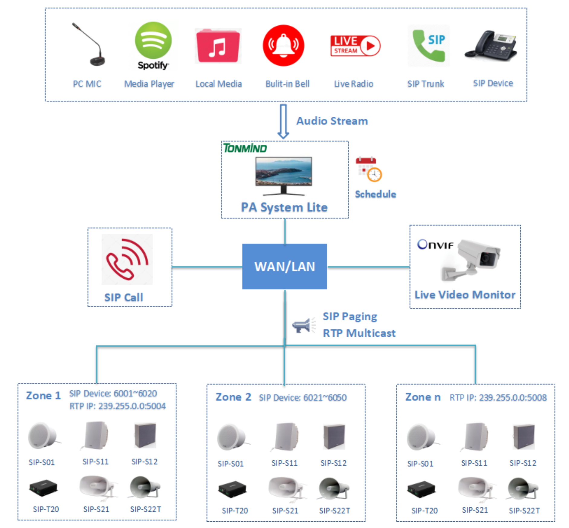 Количество управляемых платформой SIP-устройств Tonmind до 1000, столько же (до 1000) зон поддерживается в режиме RTP-мультикаст. SIP-приборами могут выступать громкоговорители, микрофонные консоли, видеодомофоны, преобразователи и т.д., и т.п.