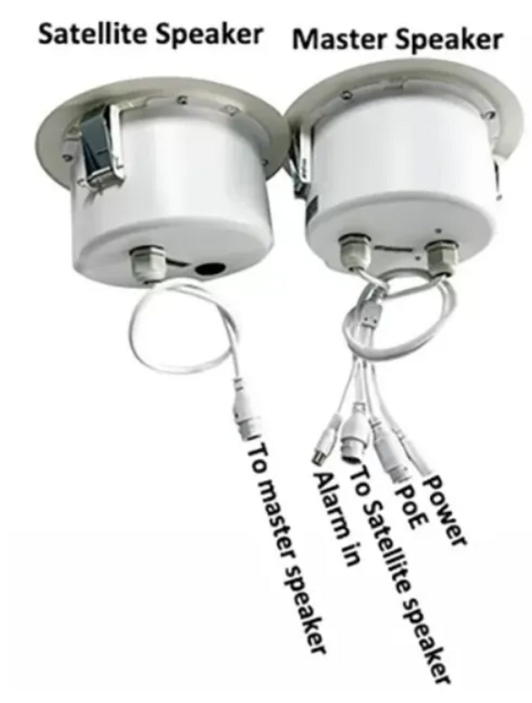 Громкоговорители из комплекта SIP-S01A изготовлены из металла, габаритные размеры каждого из них - диаметр 200 мм, глубина 90 мм, вес 1 кг. У мастера предусмотрено два варианта питания - PoE (Power on Ethernet) или от локального источника постоянного тока с напряжением 12 - 24В. Подключение через специализированный адаптер, который включает как линии питания, так и передачу данных по сети. У сателлита питание и обмен данными через кабель PoE (Ethernet). Монтаж обоих громкоговорителей врезной, в потолок.