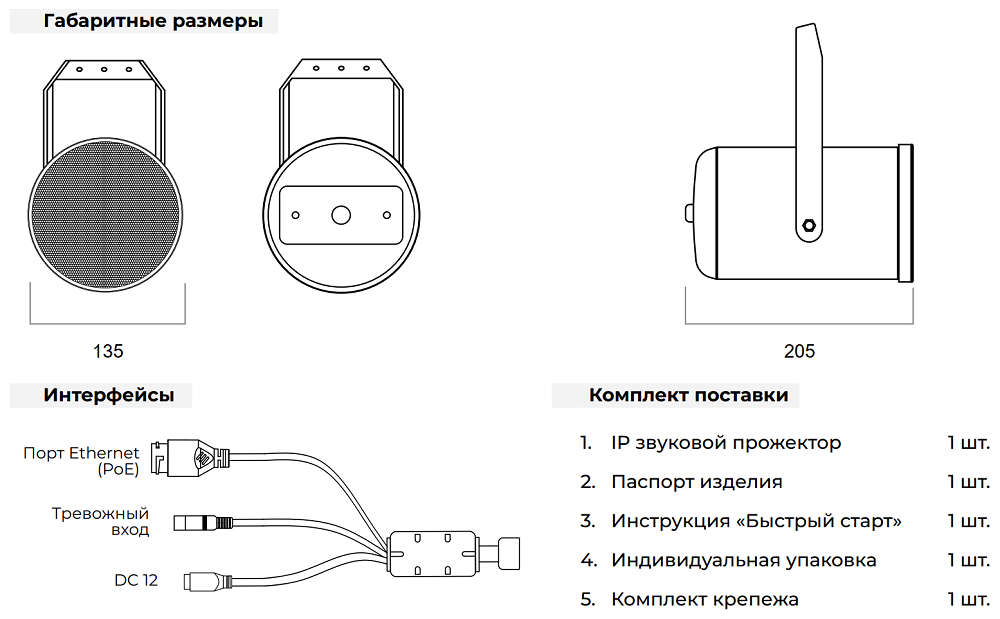 | Тип устройства | Всепогодный IP-громкоговоритель вида "звуковой прожектор" с микрофоном |