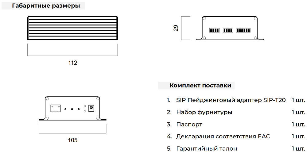 Адаптер (шлюз) SIP-T20 выполнен из металла, габаритные размеры 112х105х29 мм, вес 250 г. Питание PoE (Power on Ethernet) или от сети 220В через блок питания DC 12-24В. Монтаж настенный, в помещении. Преобразователь отлично подходит для разнообразных объектов, на которых присутствуют аналоговые акустические устройства, которые требуют модернизации в цифровые версии.