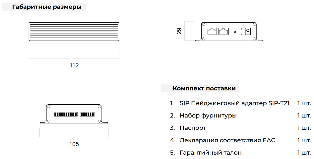 Адаптер (шлюз) SIP-T21 выполнен из металла, габаритные размеры 112х105х29 мм, вес 250 г. Питание PoE (Power on Ethernet) или от сети 220В через блок питания DC 12-24В. Монтаж настенный, в помещении. Преобразователь отлично подходит для разнообразных объектов, на которых присутствуют аналоговые акустические устройства, которые требуют модернизации в цифровые версии.