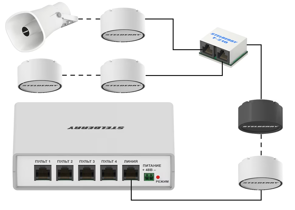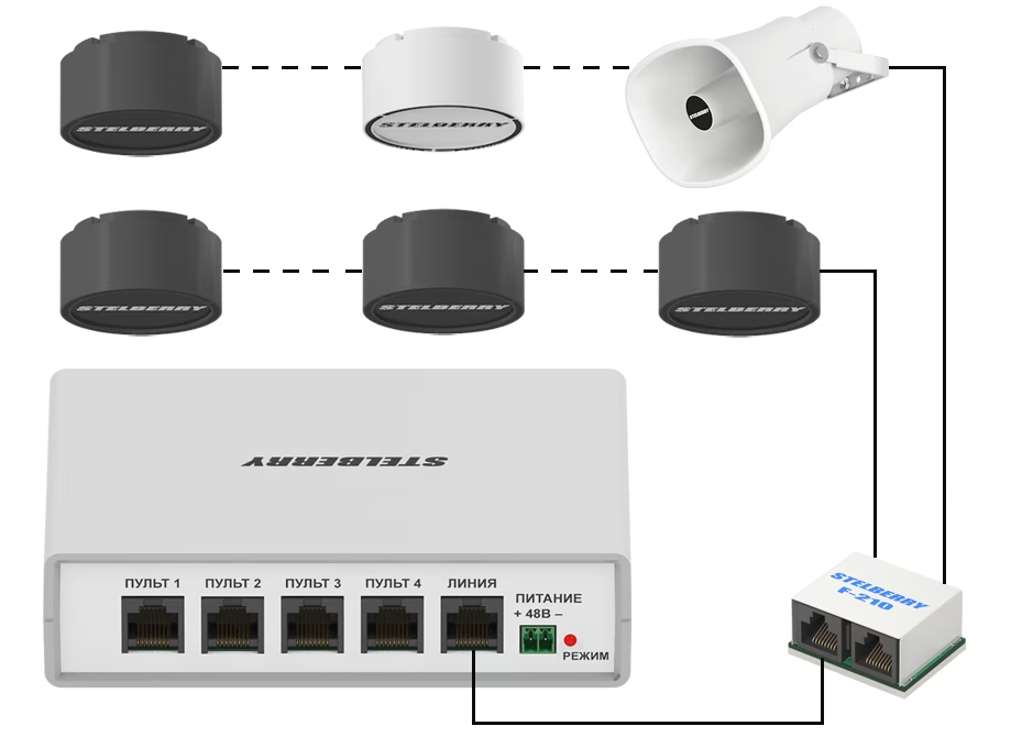 Stelberry F-210 — компактный расширитель (разветвитель) для систем громкого оповещения Антитеррор. Устройство используется для разветвления линии, к которой подключены громкоговорители, что особенно удобно, если они расположены в противоположных направлениях от выхода коммутатора Stelberry F-200.