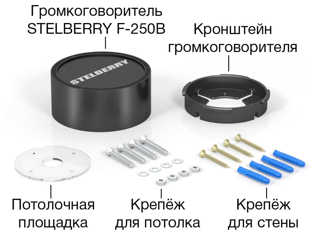 Stelberry F-250B — потолочно-настенный громкоговоритель мощностью 7 Вт, предназначенный для построения систем оповещения в помещениях. Устройство подключается к коммутатору F-200 и обеспечивает высокую разборчивость речевых сообщений, соответствуя требованиям Постановления Правительства №1006 для систем «Антитеррор».