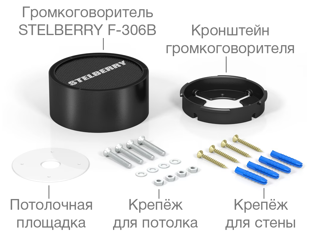 Stelberry F-306B — потолочно-настенный громкоговоритель мощностью 6 Вт в чёрном корпусе. Он предназначен для систем речевого оповещения и музыкальной трансляции и используется в кафе, ресторанах, офисах, учебных заведениях, административных зданиях, коридорах и на складах.