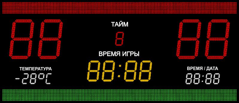 | Выводимая информация: | Счёт, текущее и игровое время, тайм, температуру воздуха и текст |