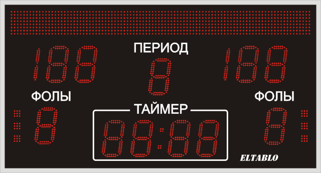 | Выводимая информация: | Счёт, игровое время, период, фолы, а также заранее запрограммированный текст |