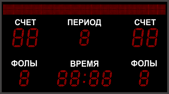 | Выводимая информация: | Счёт, игровое время, период и фолы, а также заранее запрограммированный текст |