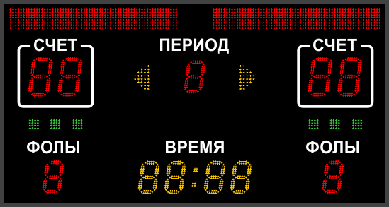 | Выводимая информация: | Счёт, игровое время, период и фолы, кол-во таймаутов, указатели, а также заранее запрограммированный текст |